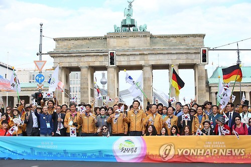 (베를린=연합뉴스) 황철환 기자 = 한반도 통일의 염원을 싣고 1만4천400㎞를 달려 온 유라시아 친선특급이 '통일의 성지' 브란덴부르크문에서 대장정의 대미를 맞이했다.