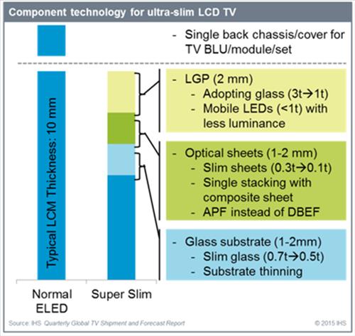 LCD TV는 액정 뒷면에서 빛을 비춰주는 광원부(백라이트유닛, BLU)가 있기 때문에 자체 발광하는 소자를 쓰는 올레드 TV보다 원천적으로 두꺼울 수밖에 없다.