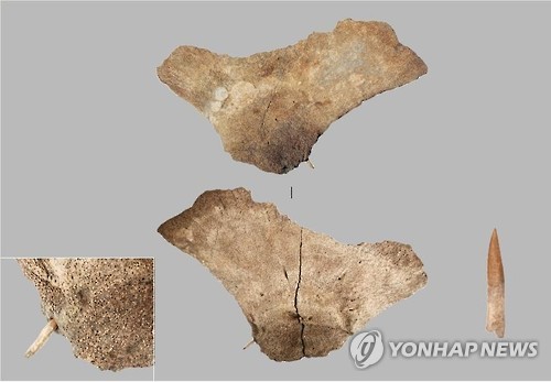 (울산=연합뉴스) 이상현 기자 = 울산박물관(관장 신광섭)은 박물관이 소장한 신석기시대 유물 '골촉(뼈로 만든 화살촉) 박힌 고래뼈'가 울산시 지정 유형문화재 제35호로 지정됐다고 3일 밝혔다.