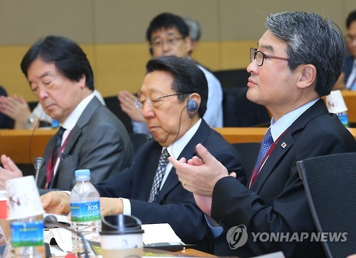 | △ 동북아시아공동체 포럼 참석한 조태용 차관 (서울=연합뉴스) 김도훈 기자 = 3일 오전 서울 성북구 고려대학교에서 '70년의 분단과 동북아 100년의 미래'를 주제로 열린 제5회 동북아시아공동체포럼에서 조태용 외교부 1차관을 비롯한 참석자들이 환영사를 듣고 박수를 치고 있다. 왼쪽부터 다나카 히토시 국제전략연구소 이사장, 천젠 전 중국외교차관보, 조태용 차관. |