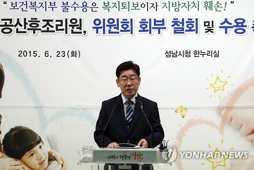 | △ 성남시는 보건복지부가 2018년부터 평균소득 이하 가구 산모에게 출산 후 산후조리 서비스를 확대할 계획이라고 밝힌 것과 관련, '성남시 무상 공공산후조리 지원사업'에 대한 원안 수용을 촉구했다. 사진은 지난 6월 성남시청에서 열린 '무상공공산후조리원, 복지부에 원안수용 촉구' 기자회견하는 이재명 성남시장의 모습. (연합뉴스 자료사진) |