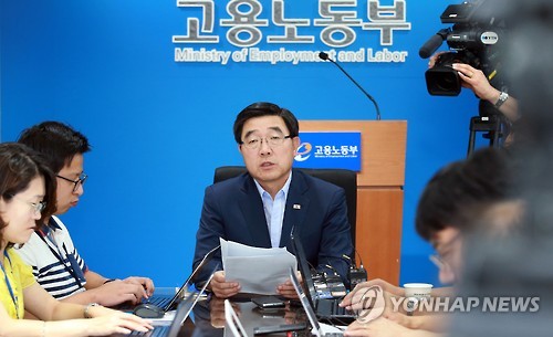 | △ 이기권 고용노동부 장관 기자간담회 (서울=연합뉴스) 이기권 고용노동부 장관이 3일 오전 정부세종청사 고용노동부에서 기자간담회를 갖고 최근 노동개혁 관련 향후 방침을 설명하고 있다. (고용노동부 제공) |