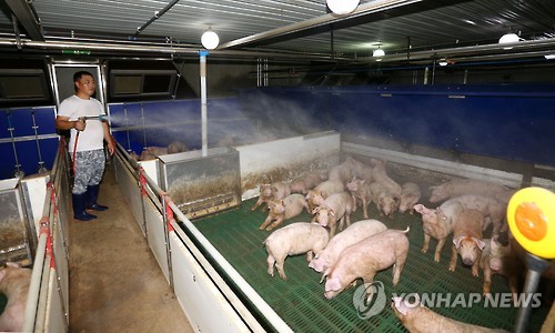 | △ 뜨거운 돼지농가 (칠곡=연합뉴스) 김준범 기자 = 폭염이 기승을 부린 3일 오후 경북 칠곡군의 한 돼지농가 주인이 축사에 물을 뿌리며 열을 식히고 있다. 경북도에 따르면 최근 사흘동안 폭염으로 25 농가에서 모두 3만4천193마리가 폐사한 것으로 나타났다. 2015.8.3 psykims@yna.co.kr |