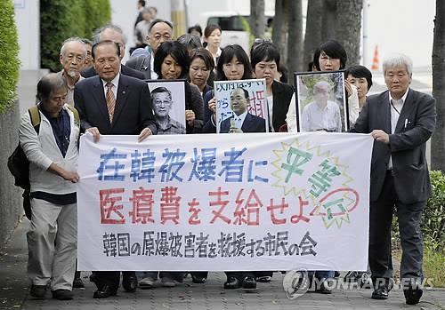 | △ 한국에 살고 있는 원폭 피해자에게 의료비를 지급하라는 내용의 현수막을 들고 오사카지법 근처를 행진하는 일본 시민단체 관계자의 모습(교도=연합뉴스 자료사진) |