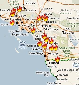 산불의 발생 범위는 캘리포니아 북부 오리건 주 경계지역에서부터 남부 멕시코 국경에까지 이르고 있다.