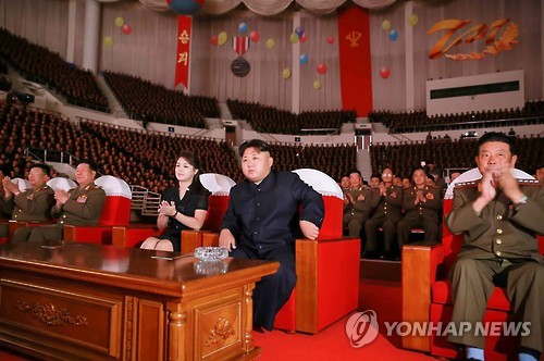 | △ 북한 김정은, 부인 리설주와 함께 합창단 공연 관람 (서울=연합뉴스) 김정은 북한 국방위원회 제1위원장이 정전협정 체결 62주년(7월27일)을 맞아 부인 리설주, 군부 지도자들과 함께 공훈국가합창단 공연을 관람했다고 노동신문이 4일 전했다. 이날 공연에는 황병서 군 총정치국장, 박영식 인민무력부장, 리영길 총참모장 등이 수행했다. 2015. 8. 4 nkphoto@yna.co.kr |