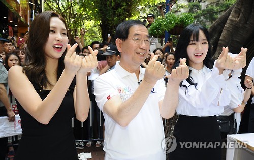 | △ 중동호흡기증후군(메르스)로 침체된 서울의 관광 산업을 살리기 위해 중국 3개도시를 방문중인 박원순 서울시장이 지난 2일 중화권 출신 미쓰에이의 페이 지아와 함께 광저우의 명동 '베이징루'에서 홍보활동을 하고 있다. |