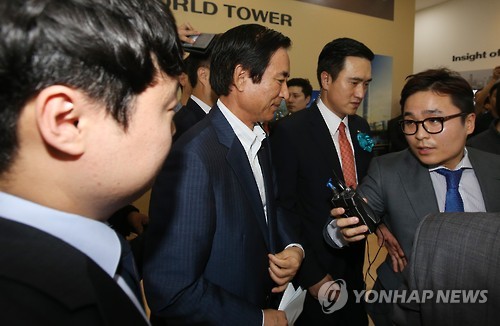 | △ 질문 집중된 노병용 롯데물산 사장 (서울=연합뉴스) 임헌정 기자 = 노병용 롯데물산 사장이 4일 서울 송파구 롯데월드타워 홍보관에서 열린 롯데그룹 긴급 사장단회의를 마치고 취재진의 질문세례를 받고 있다. 2015.8.4 kane@yna.co.kr |