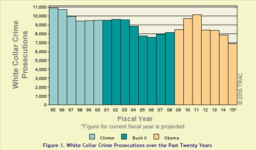 시라큐스대학의 보고서에서 2015회계연도 들어 지난 6월까지 9개월간 연방법률로 기소된 화이트칼라 범죄는 5천173건으로 이전 회계연도보다 12.3%, 1995회계연도보다 36.8% 적었다.