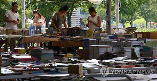 | △ 헌책방 축제 찾은 시민들 (서울=연합뉴스) 김도훈 기자 = 5일 오후 서울 여의도한강공원 마포대교 부지에서 열린 헌책방 축제를 찾은 시민들이 책을 찾아보고 있다. 서울도서관은 매주 토요일 서울도서관 앞에서 열리던 '한 평 시민 책시장' 행사를 오는 16일까지 여의도한강공원 마포대교 부지에서 운영한다. |