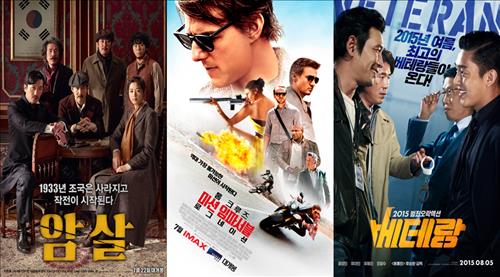 이달 영화관을 장식할 영화로는 한국영화 '암살', '베테랑'과 할리우드 인기 시리즈물인 '미션 임파서블 5'가 꼽힌다.