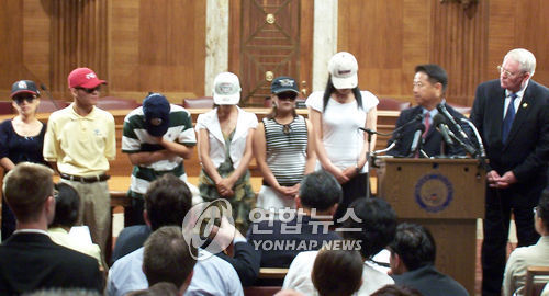 | △ 2006년 미국에 망명한 탈북자 6명이 의회에서 기자 회견을 열고 북한의 인권실태와 탈북자 문제에 대해 증언하고 있다. (연합뉴스 자료사진) |
