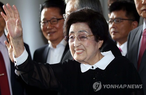 | △ 취재진 향해 손 흔드는 이희호 여사 (서울=연합뉴스) 윤동진 기자 = 고(故) 김대중 전 대통령의 부인 이희호 여사가 5일 오전 방북길에 오르기 위해 서울 김포공항으로 들어서며 취재진을 향해 손을 흔들고 있다. 이 여사는 이날 이스타항공 전세기를 이용해 서해 직항로로 평양을 방문한다. |