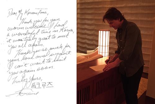톰 크루즈는 편지에 "한국에서 멋진 시간을 보냈다. 여러분을 곧 다시 만나는 일이 기다려진다"면서 끝에 한글로 자신의 이름을 썼다.