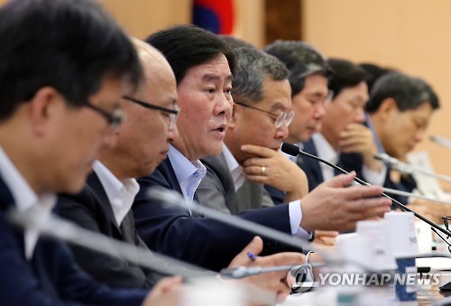 | △ 공공기관 현안점검회의 (서울=연합뉴스) 전수영 기자 = 최경환 경제부총리 겸 기획재정부 장관이 5일 오전 정부서울청사에서 열린 공공기관 현안점검회의에서 모두발언을 하고 있다. 최 부총리는 "8월에는 LH, 철도공사 등 대규모 기관이 선도해 임금피크제 관련 노사합의를 이끌어야 한다"고 말하는 등 공공기관의 신속한 임금피크제 도입을 독려했다. 2015.8.5 swimer@yna.co.kr |