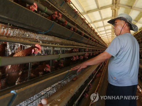 | △ '죽지마라 얘들아' (김제=연합뉴스) 임채두 기자 = 5일 오후 전북 김제시 용지면 용수리에서 양계장을 운영하고 있는 조덕곤(54)씨가 축사 내부를 둘러보고 있다. |
