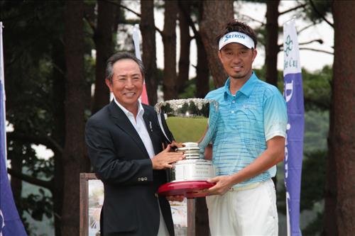 | △ 8월 4-5일 이틀간 일본 돗토리현의 다이센 골프클럽에서 열린 '제2회 다이센컵 골프대회'에서 최종태 야마젠 그룹 회장(왼쪽)이 호시노 히데마사 프로에게 우승컵을 전달하고 있다. |