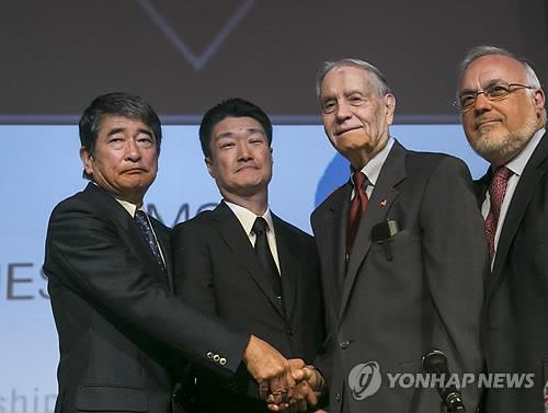 | △ (AP=연합뉴스) 일본 미쓰비시머티리얼의 오카모토 유키오 사외이사(왼쪽)와 기무라 히카루 상무(왼쪽 두번째)가 2015년 7월 19일(현지시간) 미국 로스앤젤레스에서 2차대전 당시 일본군 포로로 붙잡혀 강제노역했던 전 미군 병사 제임스 머피(94) 씨의 손을 붙잡고 있다. |