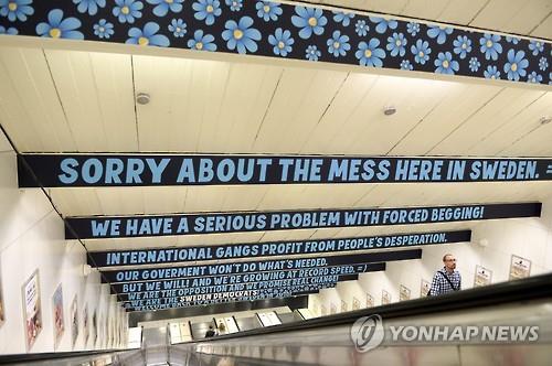 반이민주의를 내세운 스웨덴 3대 정당인 스웨덴민주당이 지하철역 진입통로 천장에 줄지어 내건 이 광고는 영어로 제작됐으며, 관광객에게 스웨덴 수도가 구걸 행위로 엉망인 상태가 됐다며 사과하는 문구로 시작된다.