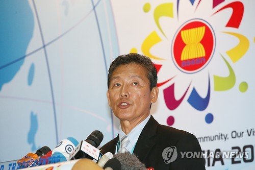 | △ 질문에 답하는 리동일 외무성 대변인 (쿠알라룸푸르=연합뉴스) 박동주 기자 = 북한 리동일 외무성 대변인이 6일 말레이시아 쿠알라룸푸르 푸트라세계무역센터(PWTC)에서 기자회견을 하고 있다. |