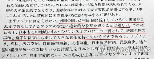 보고서는 이런 평가를 토대로 "미국의 국력이 상대적으로 저하하는 가운데 미국이 지금까지 수행한 아시아 안정에 절대적인 역할을 담당하는 것은 어렵다"며 "일본도 이 지역 세력균형(balance of power)의 일익으로서 지역 전체의 평화와 번영에 종래보다 한층 큰 책임을 담당해야 할 것"이라고 자국의 역할을 규정했다.