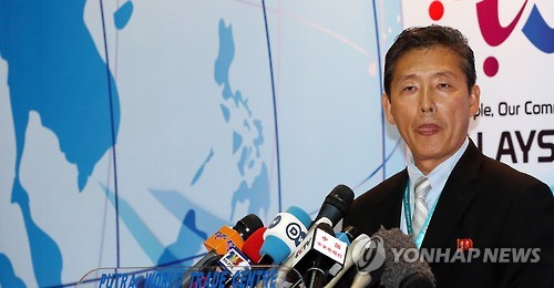| △ 기자회견하는 북한 리동일 (쿠알라룸푸르=연합뉴스) 박동주 기자 = 북한 리동일 외무성 대변인이 6일 말레이시아 쿠알라룸푸르 푸트라세계무역센터(PWTC)에서 기자회견을 하고 있다. |