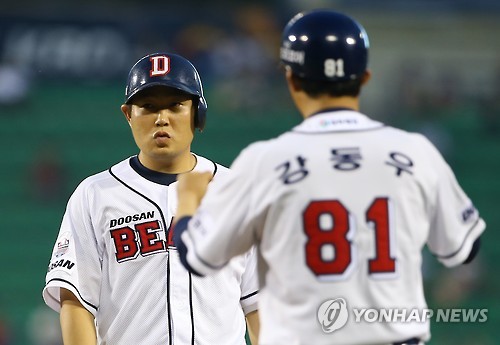 | △ 적시타 치고도 무덤덤한 양의지 (서울=연합뉴스) 김도훈 기자 = 6일 오후 서울 잠실야구장에서 열린 2015 프로야구 넥센 히어로즈와 두산 베어스 경기. 4회말 무사 1,2루 두산 양의지가 1타점 적시타를 쳐낸 뒤 무덤덤한 표정으로 강동우 코치의 축하를 받고 있다. 2015.8.6 superdoo82@yna.co.kr |