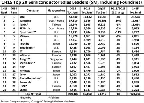 IC인사이츠의 톱 20 반도체 매출 리더 순위표에는 세계 최대 파운드리 업체인 TSMC(대만)가 인텔, 삼성에 이어 3위에 올랐다.