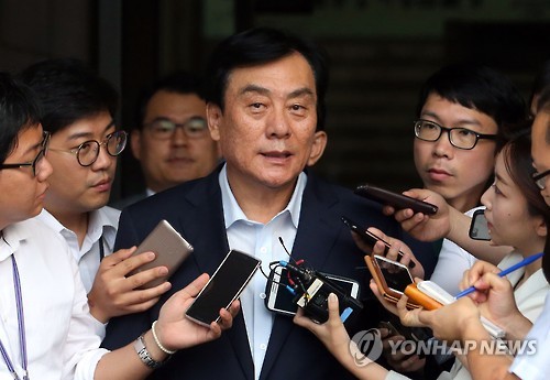 | △ 지난달 30일 새정치민주연합 박기춘 의원이 밤샘조사를 마치고 서울 서초구 중앙지검을 나서며 취재진의 질문을 받고 있다. (연합뉴스 자료사진) |