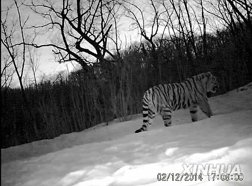 | △ (선양=연합뉴스) 홍창진 특파원 = 중국 동북지방 지린(吉林)성지역에 야생 백두산 호랑이(중국명 둥베이후·東北虎) 5가족이 생활하는 것으로 나타났다. 사진은 훈춘 국가급 자연보호구에서 관측카메라에 포착된 백두산 호랑이. (연합뉴스 DB) realism@yna.co.kr |