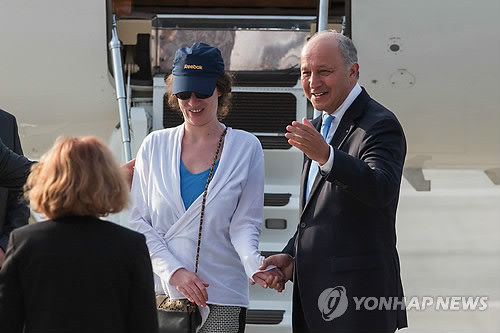 | △ 예멘서 납치된 프랑스 여성 귀환 (파리 AP=연합뉴스) 로랑 파비위스 프랑스 외무장관(오른쪽)이 7일 파리 서쪽 군용공항에 이사벨 프림(31)이 도착하자 안내를 하고 있다. 프림은 예멘에서 세계은행 컨설턴트로 일하다 지난 2월 반군 장악 지역인 사나에서 예멘인 통역사와 함께 납치됐다. |