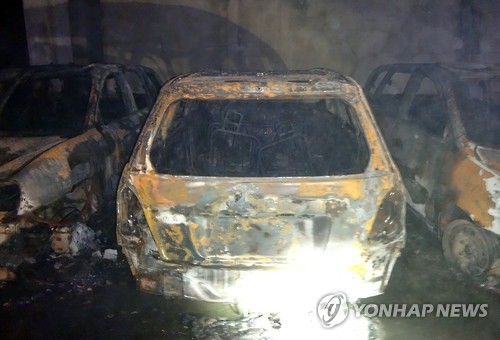 | △ 양주 아파트 지하주차장서 차량 7대 불타 (양주=연합뉴스) 노승혁 기자 = 8일 오전 2시 21분께 경기도 양주시 덕계동 아파트 지하 1층 주차장에 세워져 있던 차량에서 원인을 알 수 없는 불이나 소방당국이 1시간여 만에 불을 껐다. 다행히 인명 피해는 발생하지 않았지만 주차된 차량 14대 중 7대가 불에 타 소방서 추산 7천만원의 피해가 났다. 사진은 불탄 승용차들. 2015.8.8 <<양주소방서 제공>> nsh@yna.co.kr |