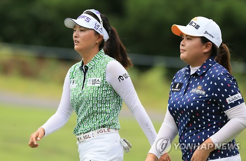 | △ 나란히 이동하는 박인비와 고진영 (제주=연합뉴스) 박지호 기자 = 7일 제주시 오라컨트리클럽에서 열린 한국여자프로골프(KLPGA) 투어 제주 삼다수 마스터스 1라운드에서 박인비(KB금융)와 고진영(넵스)이 나란히 4번홀로 이동하고 있다. 2015.8.7 jihopark@yna.co.kr |