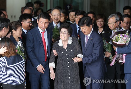 | △ 방북 마친 이희호 여사 (서울=연합뉴스) 이정훈 기자 = 3박 4일간의 방북 일정을 마친 이희호 여사가 8일 오후 김포공항을 통해 귀국하고 있다. |
