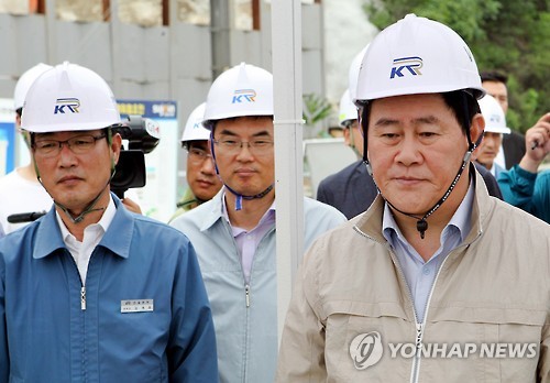 | △ 추경사업 현장 점검하는 최경환 경제부총리 (원주=연합뉴스) 배연호 기자 = 최경환 경제부총리 겸 기획재정부 장관이 10일 강원 원주시 호저면 원주∼강릉 복선전철 건설현장을 점검하고 있다. 최 경제부총리는 이날 현장사무소 회의실에서 현황을 보고받고 소막골터널 건설현장 등을 점검했다. |