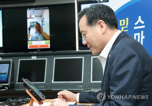 | △ 김현웅 법무부 장관, '스마트 접견' 시연 (서울=연합뉴스) 김현웅 법무부 장관이 10일 오전 경기도 과천시 정부과천청사 법무부 교화방송센터에서 서울남부교도소 수형자 및 서울소년원 학생과 스마트 접견을 시연하고 있다. 법무부는 오는 31일부터 교도소, 소년원에 있는 가족과 스마트폰 영상으로 만나는 '스마트 접견'을 시행한다. (법무부 제공) |