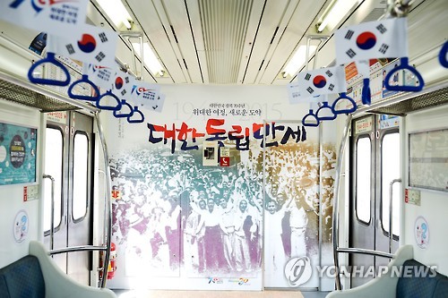 | △ '광복 70주년' 부산도시철도에 광복열차 (부산=연합뉴스) 10일 부산교통공사가 광복 70주년을 맞아 도시철도 1호선에서 운행을 시작한 광복열차. 2015.8.10 << 부산교통공사 >> youngkyu@yna.co.kr |
