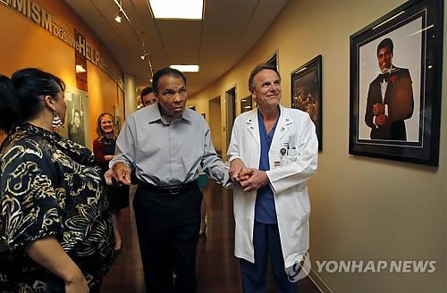 | △ 무하마드 알리는 대표적인 파킨슨병 환자다. 한때 링 위를 지배하던 무하마드 알리는 40대 초반에 파킨슨병 진단을 받았다. 알리가 '알리 파킨슨병 센터'에서 자신의 젊은 시절 사진을 바라보고 있다. (AP=연합뉴스 자료사진) |