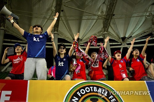 | △ South Korean soccer fans celebrate with their fans after being named champions of the East Asian Cup in Wuhan in central China's Hubei Province, Sunday, Aug. 9, 2015. (AP Photo/Mark Schiefelbein) |