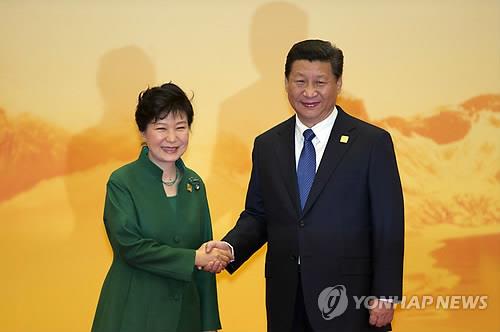| △ 지난해 11월 베이징에서 열린 APEC 정상회의에서 만난 박근혜 대통령과 시진핑 중국 국가주석.(AP=연합뉴스DB) |