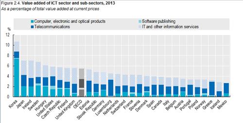 한국은 소프트웨어 출판(0.17%), 통신(1.23%), 정보기술(IT) 서비스(1.91%) 분야에서는 일본, 아일랜드 등 10위 이내 국가에 비해 전반적으로 부가가치 비중이 뒤졌으나 컴퓨터 및 전자·광학 기기의 부가가치 비중이 워낙 커 무난히 1위를 차지했다.