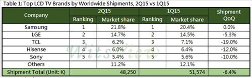 반면 중국업체인 TCL의 점유율은 7.1%에서 6.2%로, 하이센스는 6.4%에서 6.0%로 감소했다. 특히 이들 업체의 전분기 대비 출하량은 19%와 12% 급감했다.