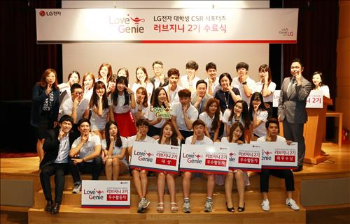 (서울=연합뉴스) 옥철 기자 = LG전자[066570]는 10일 여의도 LG트윈타워에서 대학생 CSR(Corporate Social Responsibility, 기업의 사회적 책임) 전문가 양성 프로그램 '러브지니(Love Genie)' 2기 수료식을 했다고 11일 밝혔다.