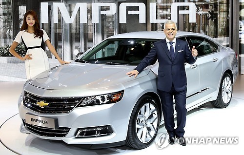 | △ 세르지오 호샤 사장, '임팔라 좋아요' (서울=연합뉴스) 한국지엠 세르지오 호샤 사장이 11일 서울 장충동 신라호텔에서 열린 쉐보레 플래그십 세단 '임팔라' 신차 발표회에서 차량 옆에서 모델과 함께 포즈를 취하고 있다. 2015.8.11 << 한국지엠 제공 >> photo@yna.co.kr |