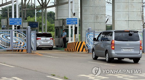 | △ 이상 증상을 보이는 것으로 알려진 금강산 지역의 소나무 상태를 확인하기 위해 산림과 수목분야의 전문가, 현대아산 관계자들이 방북하는 차량이 지난달 29일 오전 동해선남북출입사무소 출경게이트를 통과하고 있다. (연합뉴스 자료사진) |