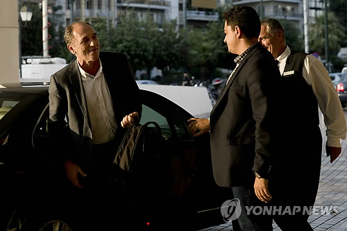 | △ 그리스-채권단, 3차 구제금융 잠정 합의 (아테네 AP=연합뉴스) 그리스와 국제 채권단이 3차 구제금융 협상안에 잠정 합의해 조만간 최종 타결될 것으로 전망된다. 사진은 10일(현지시간) 기오르고스 스타타키스 그리스 경제장관(왼쪽)이 채권단과 구제금융 협상을 갖기 위해 아테네 중심가 호텔에 도착하며 환하게 미소 짓는 모습. |