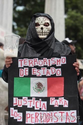 | △ 지난달말 멕시코 베라크루스 주정부를 비판하는 보도를 하다가 협박을 받고 피신해있던 주간지 기자 루벤 에스피노사가 피살된 사건과 관련해 지난 8일 동료 기자 등이 수도 멕시코시티에서 시위를 벌이고 있다. (EPA=연합뉴스DB) |