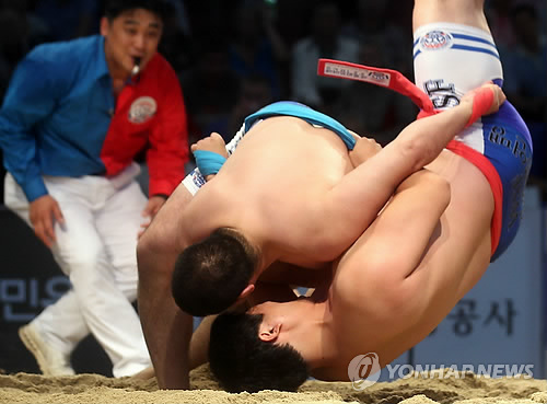 | △ 전 세계 씨름인들이 다음 달 미얀마 양곤에서 금메달을 놓고 열전을 펼친다. 사진은 지난 2011년 서울에서 열린 월드씨름챔피언십 씨름 경기 모습. (연합뉴스 자료사진) |