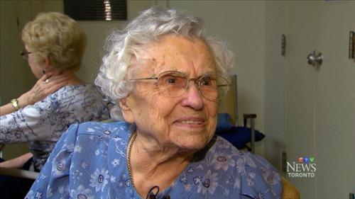 | △ 30년 간 자원봉사를 해온 토론토 병원에서 105세 생일 잔칫상을 받은 올리브 도즈 할머니.<<CTV 홈페이지 화면 캡처>> |