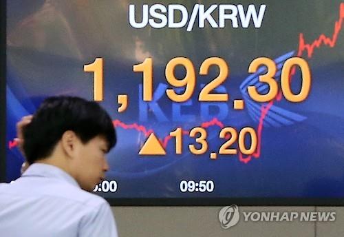 중국의 위안화 추가 평가절하 영향으로 원/달러 환율이 이틀째 급등해 장중 1,190원대로 올라섰다. 오늘 서울 외환시장에서 원/달러 환율은 오전 10시24분께 1,192.8원까지 올랐다. 전날 오전 중국 인민은행이 위안/달러 기준환율을 1.86% 높인 가격에 고시하면서 원/달러 환율도 3년 2개월 만에 최고치로 마감했다. 원/달러 환율은 이날 중국이 위안화를 1.62% 추가 절하한 영향으로 또다시 상승 압력을 받았다.